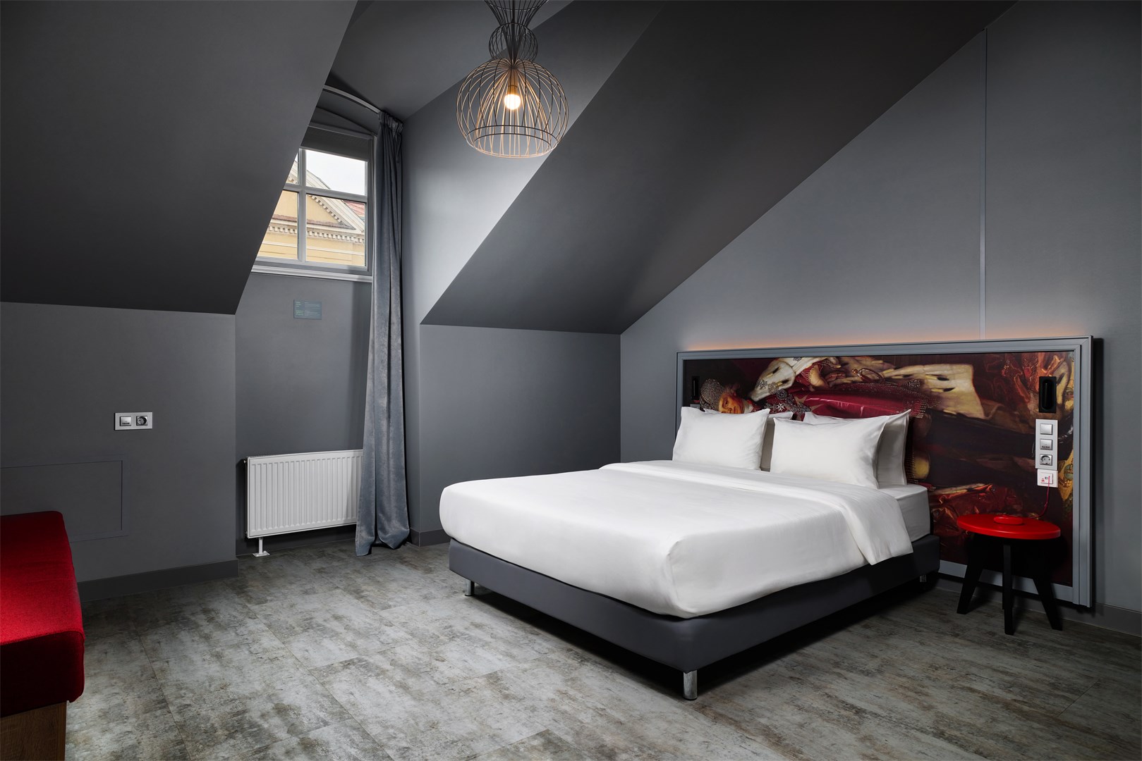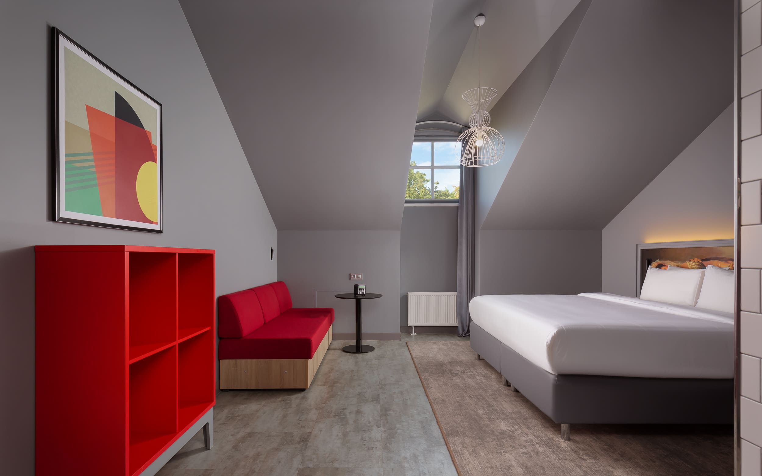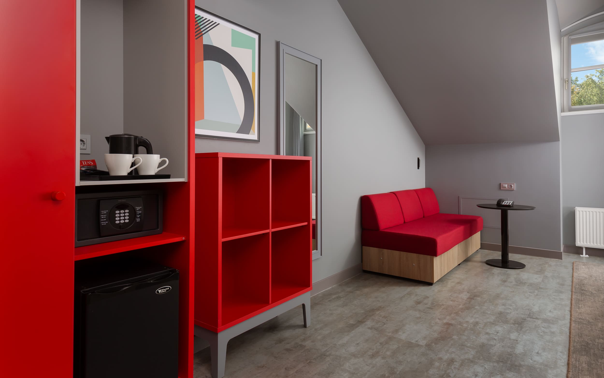 Однокомнатный номер на мансарде отеля, включает в себя одну двуспальную и одну двухъярусную кровать, телевизор, сейф, мини-холодильник, утюг, гладильную доску, набор для приготовления чая/кофе. Собственная ванная комната с душевой кабиной, феном, косметическими и гигиеническими принадлежностями.