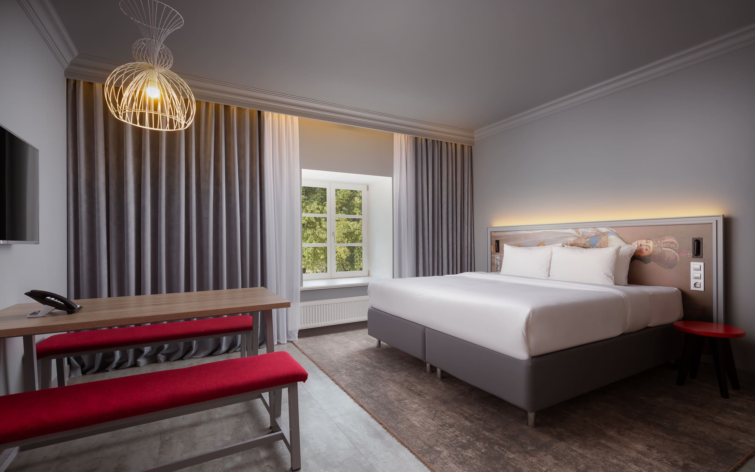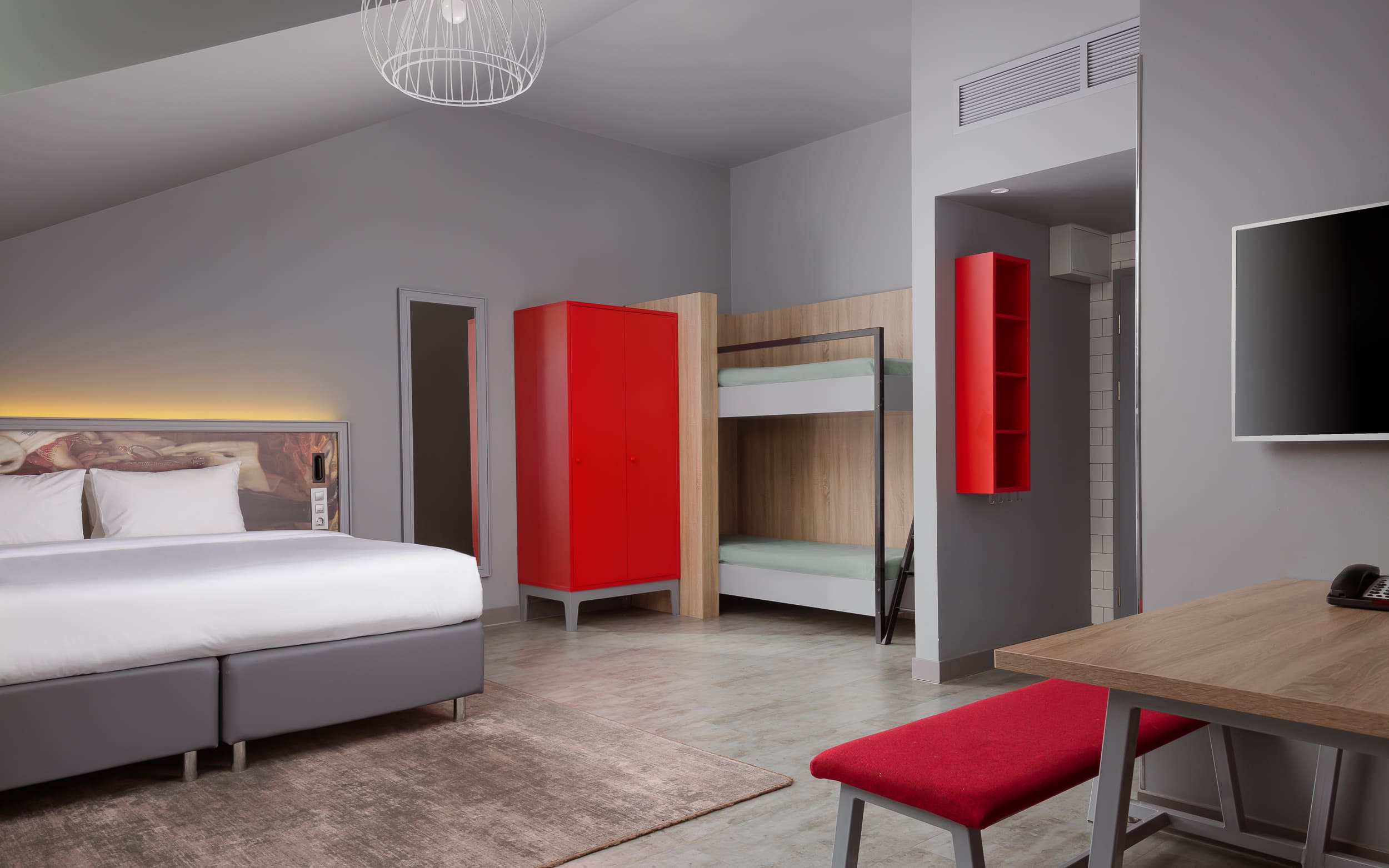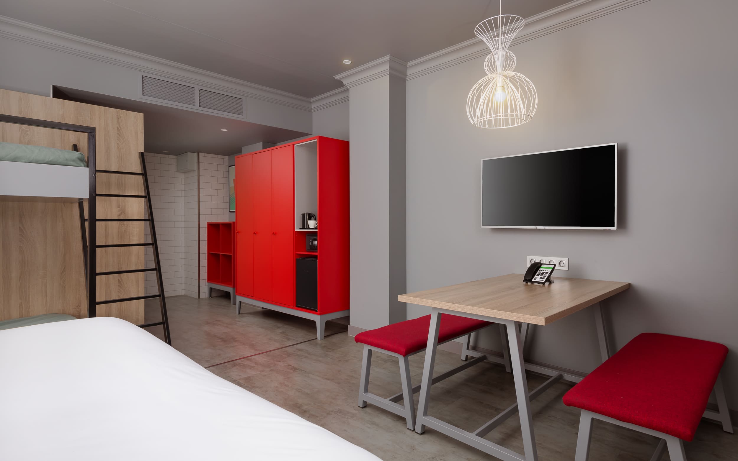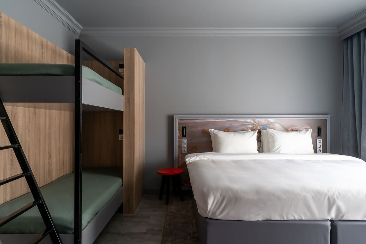 Однокомнатный номер на мансарде отеля, включает в себя одну двуспальную и одну двухъярусную кровать, телевизор, сейф, мини-холодильник, утюг, гладильную доску, набор для приготовления чая/кофе. Собственная ванная комната с душевой кабиной, феном, косметическими и гигиеническими принадлежностями.
