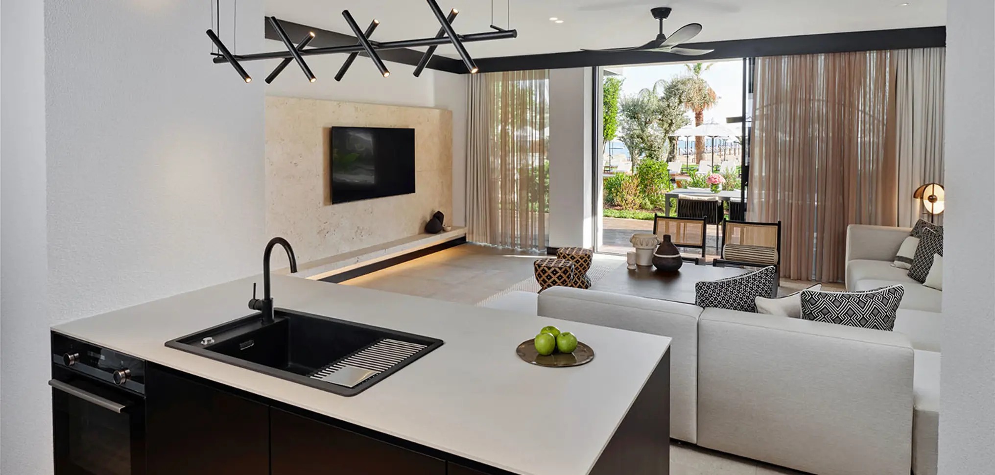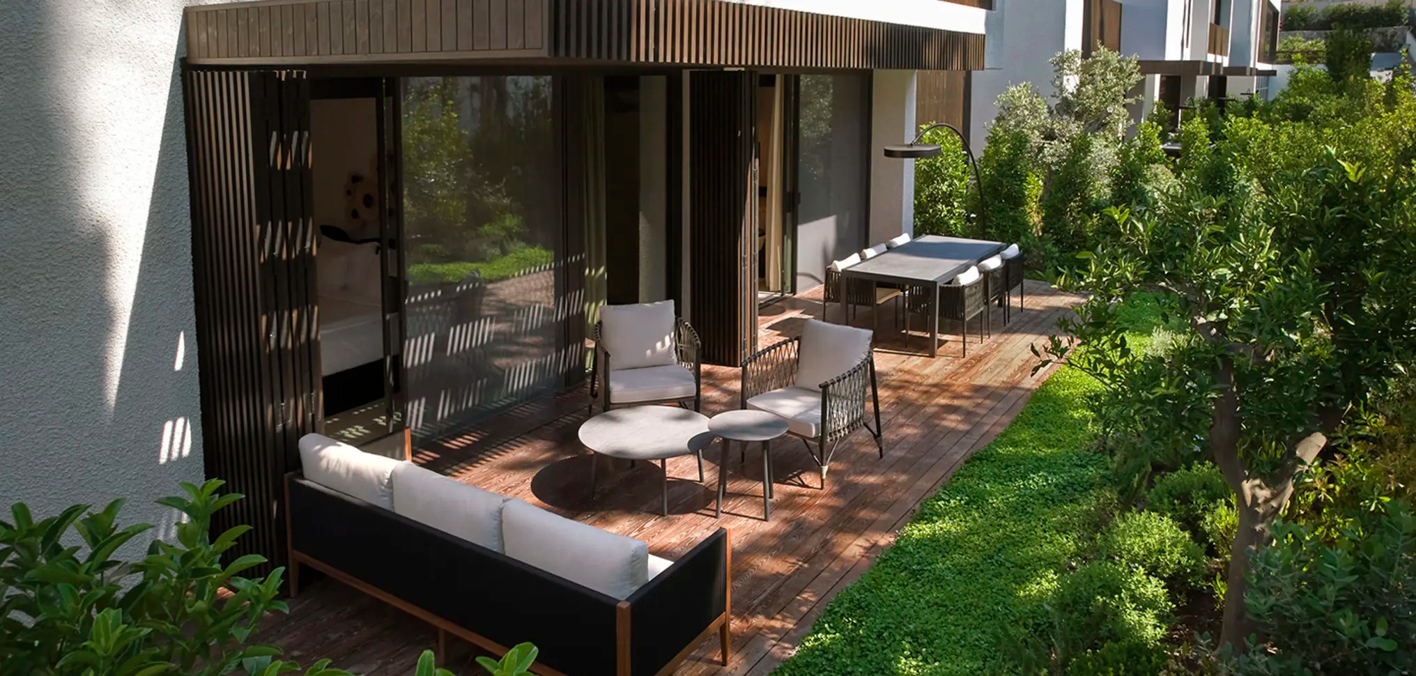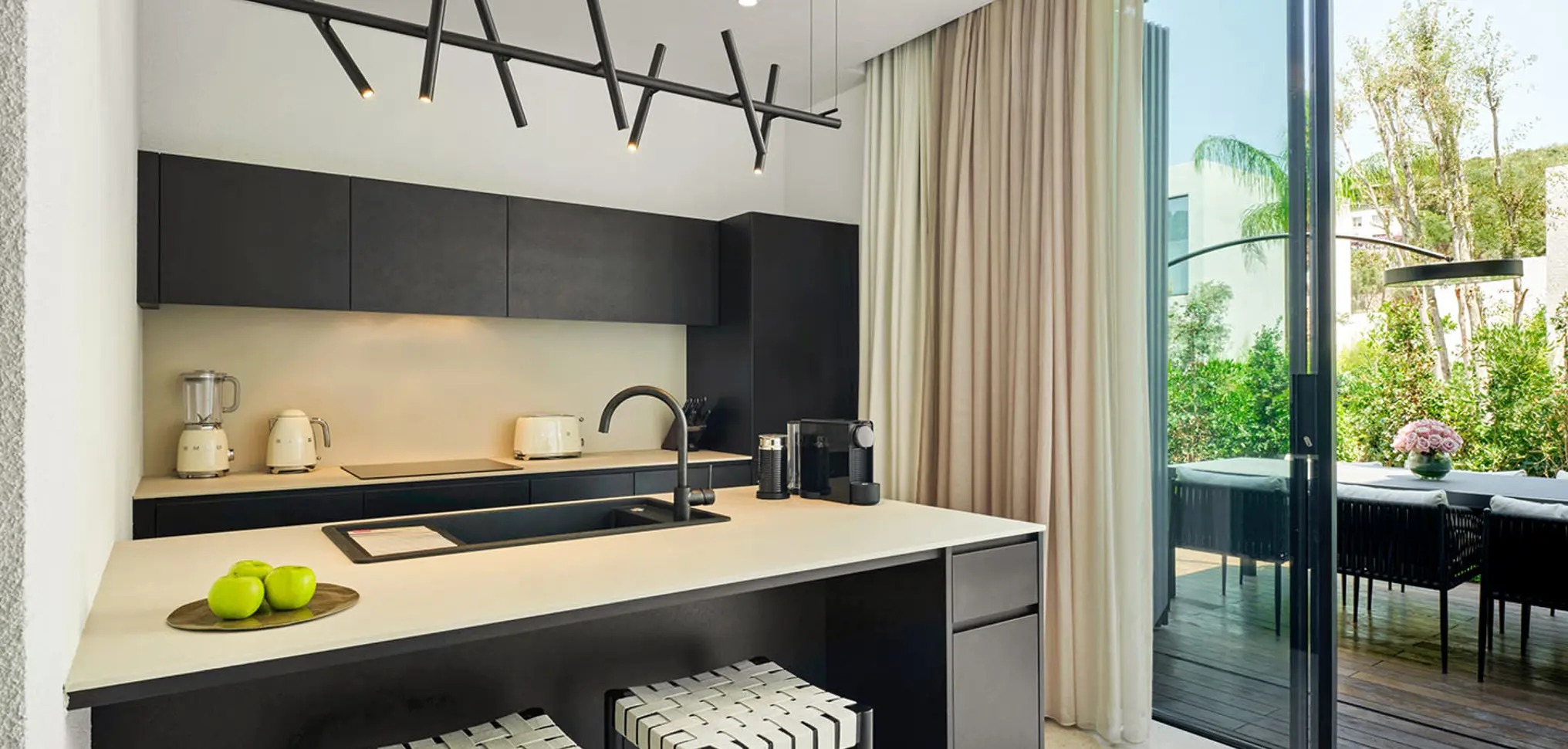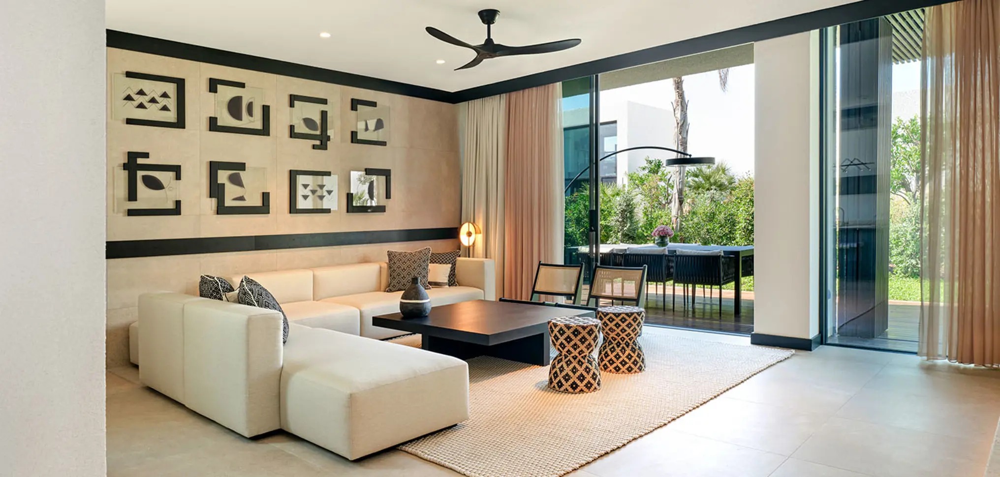 Просторная, двухэтажная резиденция состоит из двух спальных комнат с одной двуспальной и 2-мя раздельными кроватями, гостиной с мягкой мебелью, кухни открытой планировки, двух санузлов с душем, гардеробной, меблированной террасы с видом на сад. Оборудован телевизором, кондиционером, Wi-Fi, сейфом, мини-баром, стиральной машиной, диваном и обеденным столом в саду, чайными принадлежностями, феном, гигиеническими средствами.