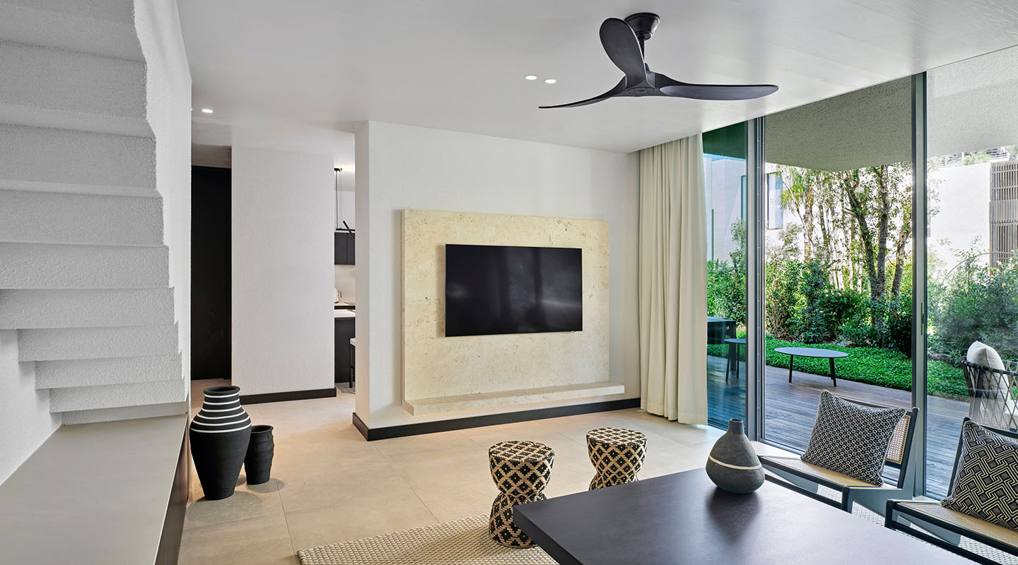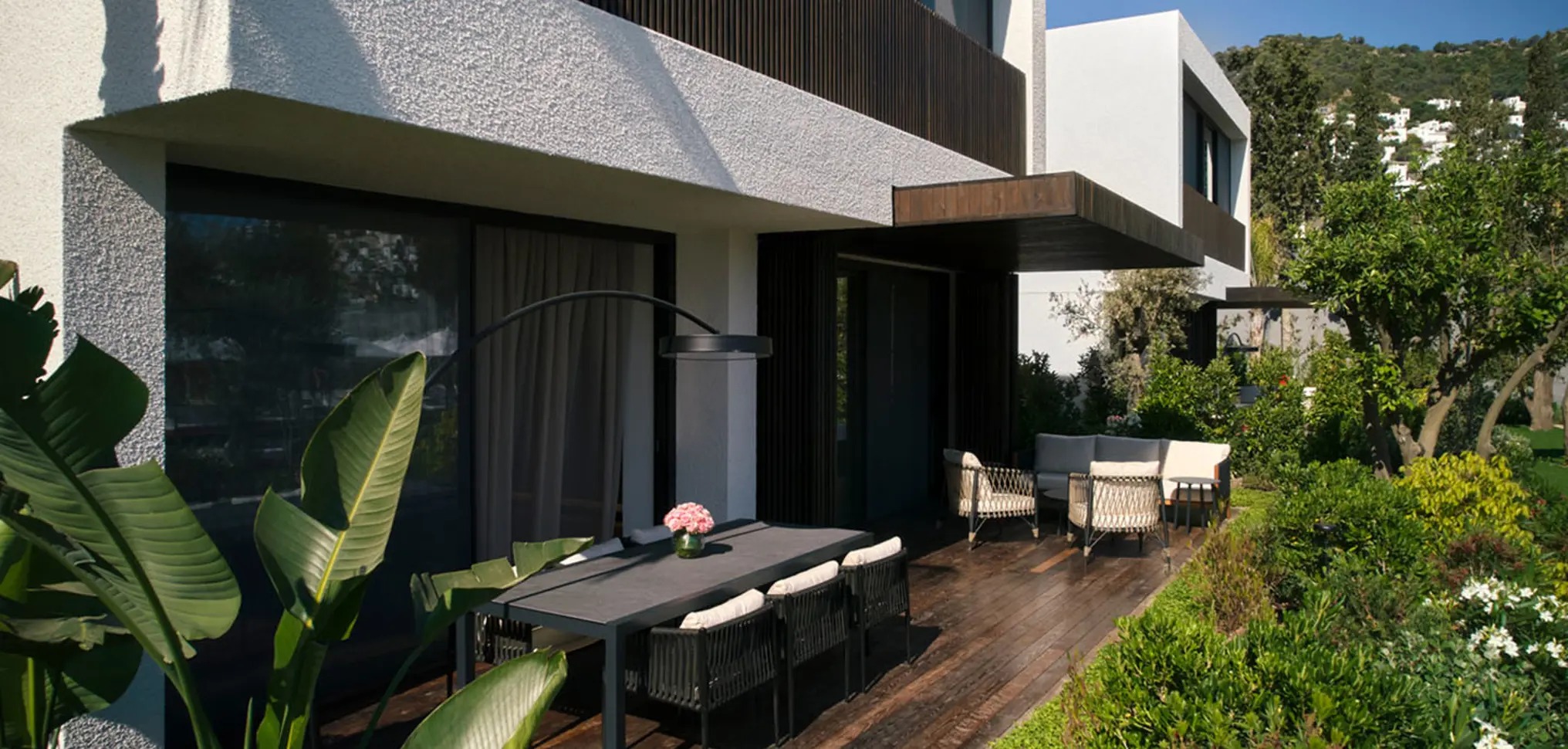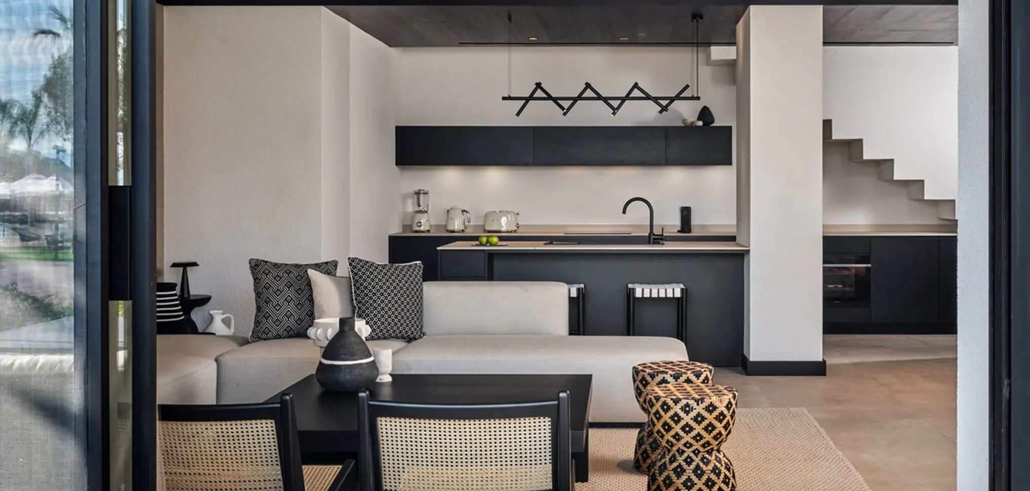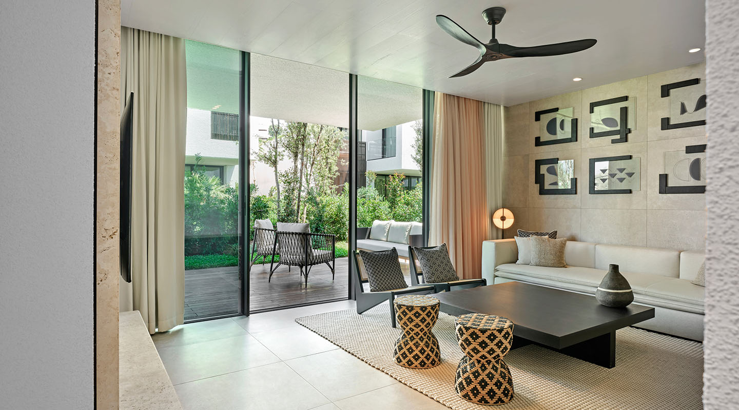 Просторная, двухэтажная резиденция состоит из двух спальных комнат с одной двуспальной и 2-мя раздельными кроватями, гостиной с мягкой мебелью, кухни открытой планировки, двух санузлов с душем, гардеробной, меблированной террасы с видом на сад. Оборудован телевизором, кондиционером, Wi-Fi, сейфом, мини-баром, стиральной машиной, диваном и обеденным столом в саду, чайными принадлежностями, феном, гигиеническими средствами.