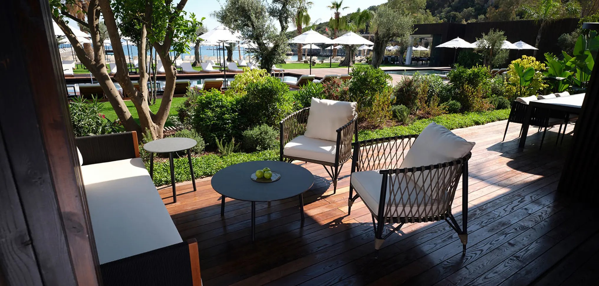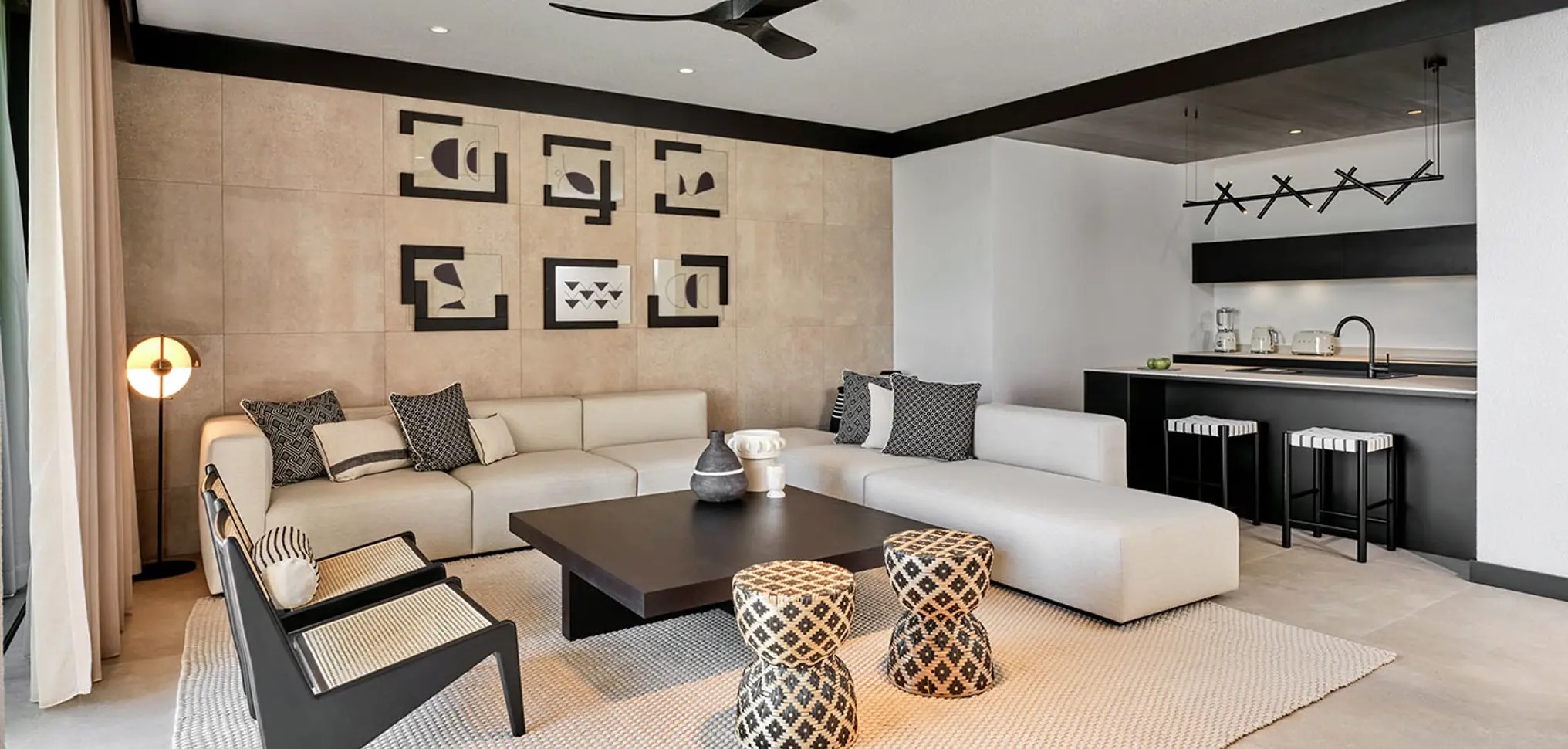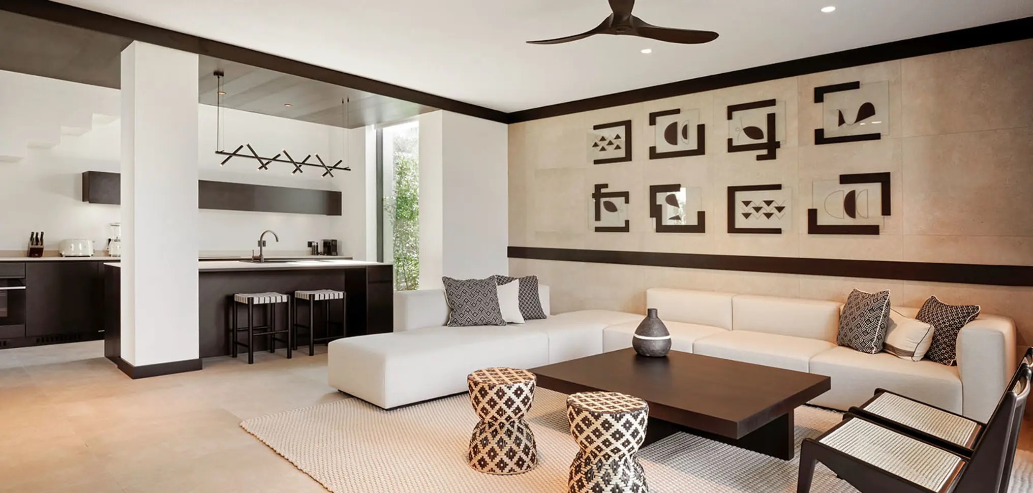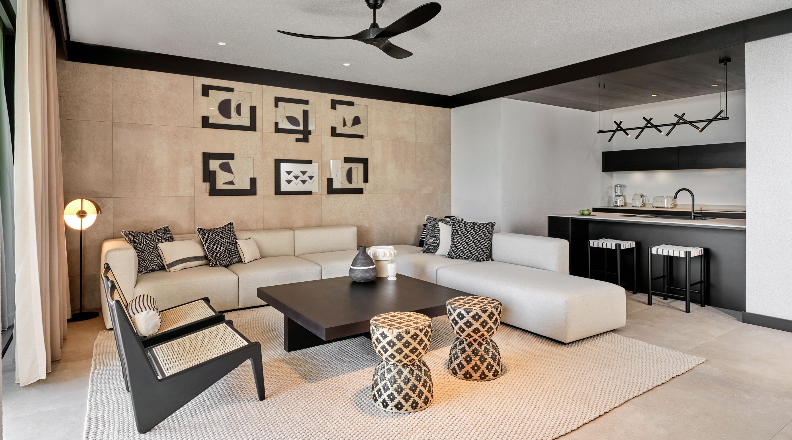 Просторная, двухэтажная резиденция состоит из двух спальных комнат с одной двуспальной и 2-мя раздельными кроватями, гостиной с мягкой мебелью, кухни открытой планировки, двух санузлов с душем, гардеробной, меблированной террасы с видом на сад. Оборудован телевизором, кондиционером, Wi-Fi, сейфом, мини-баром, стиральной машиной, диваном и обеденным столом в саду, чайными принадлежностями, феном, гигиеническими средствами.