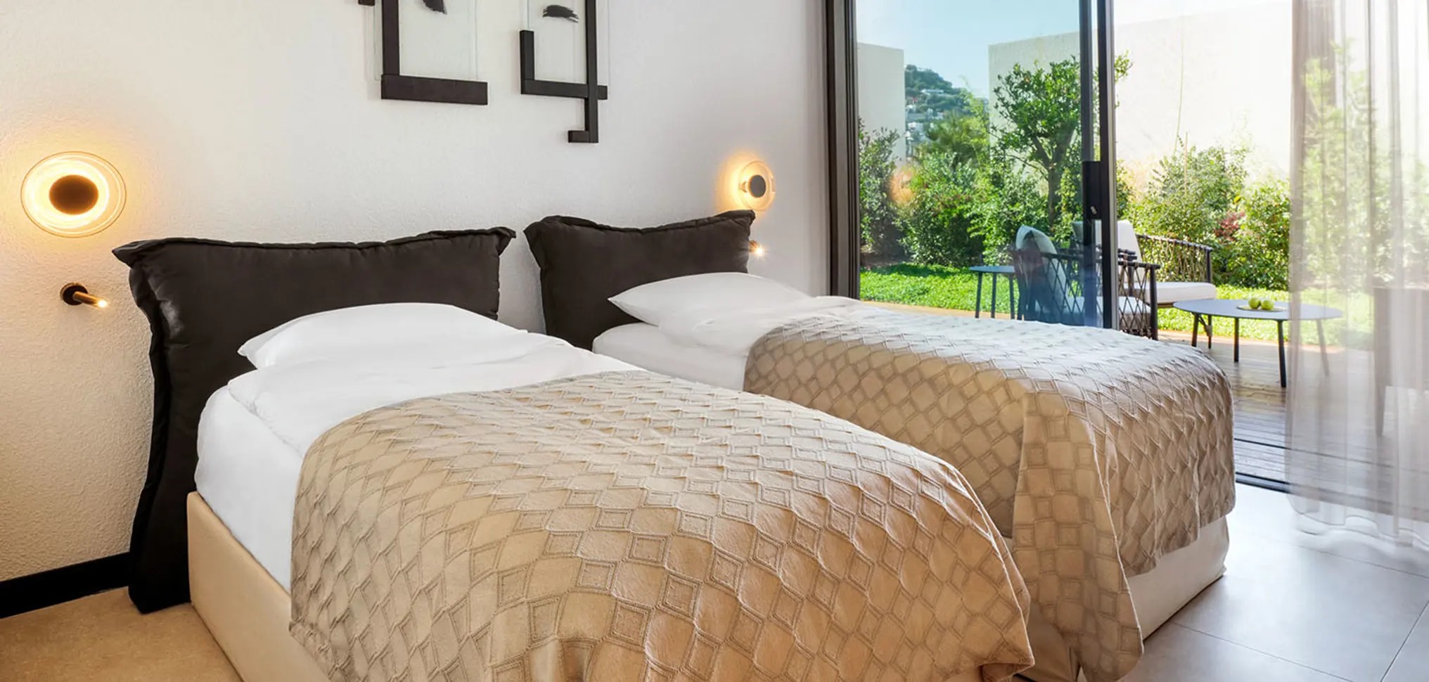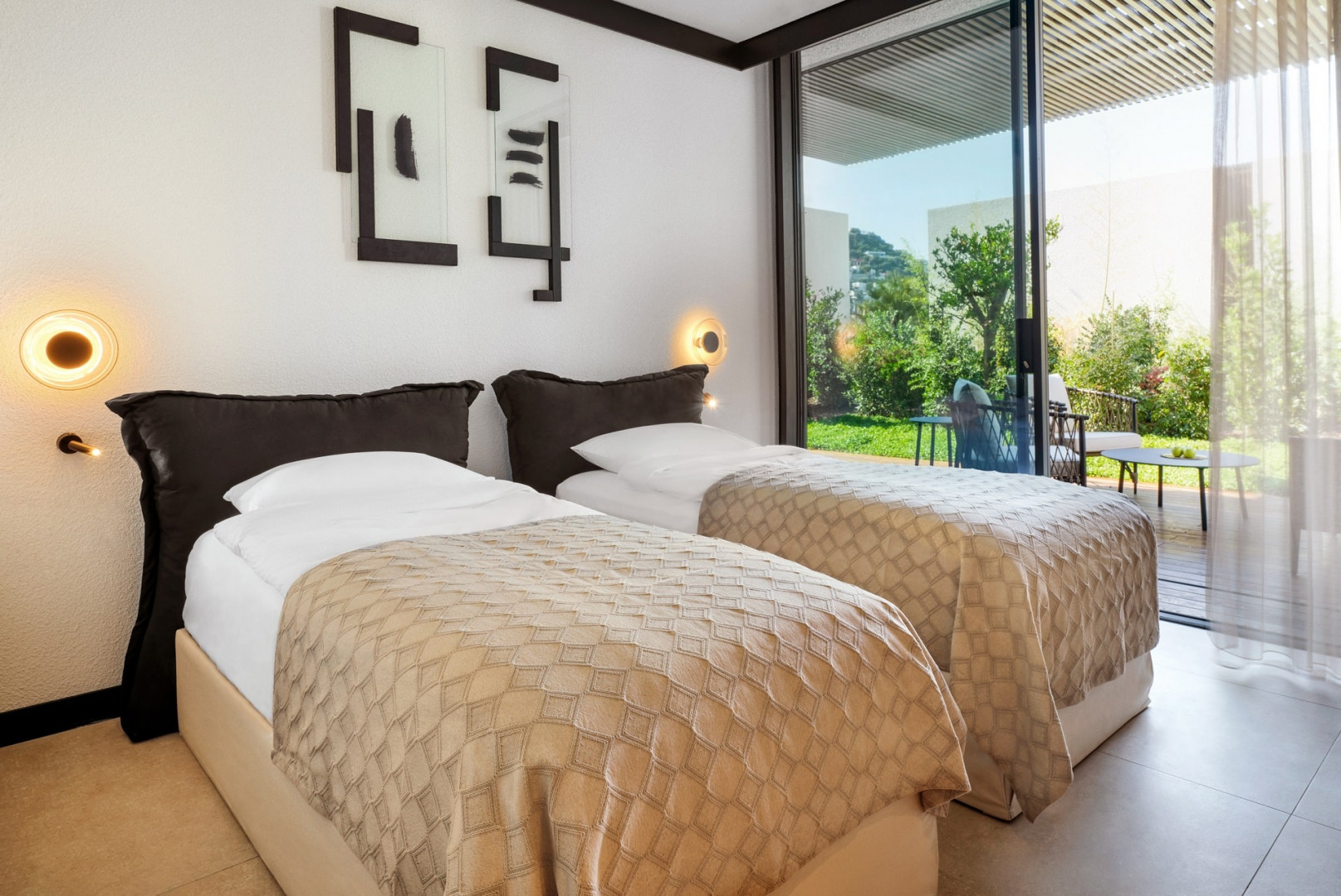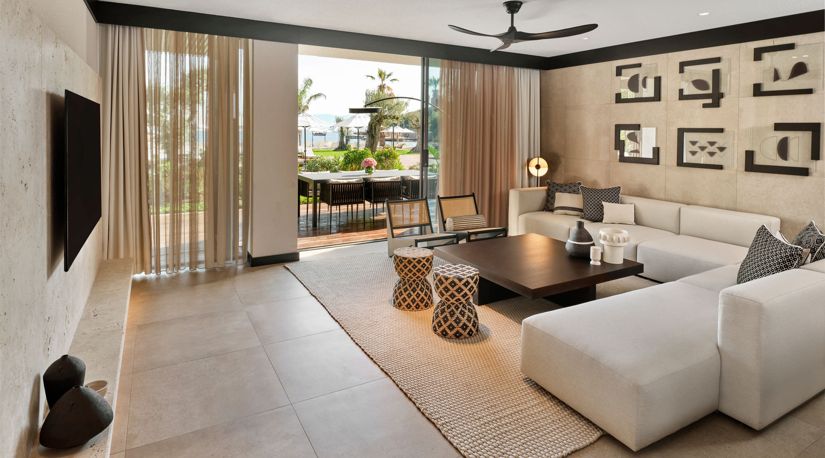 Комфортабельный номер с меблированной террасой, 2-мя спальнями с одной двуспальной и 2-мя односпальными кроватями, гостиной, комнатой для няни, прачечной, 3-мя санузлами с душем и оборудованной кухней. Укомплектован телевизором, кондиционером, сейфом, электрическим чайником, варочной поверхностью, микроволновой печью, стиральной машиной, феном, туалетными принадлежностями, садовой мебелью, обеденным столом.