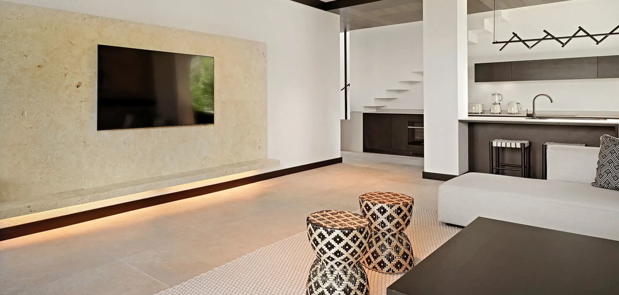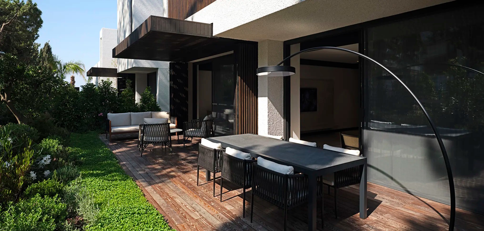 Двухуровневая резиденция включает в себя спальню с двуспальной кроватью, гостиную с мягкой мебелью, кухню, ванную комнату с душем, террасу с шезлонгами, сад, садовую мебель и обеденный стол. Из удобств телевизор, кондиционер, сейф, чайный набор, холодильник, варочная поверхность, микроволновая печь, стиральная машина, фен.